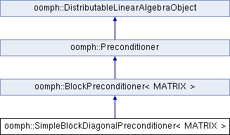 Inheritance diagram for oomph::SimpleBlockDiagonalPreconditioner< MATRIX >:Public Member Functions | |