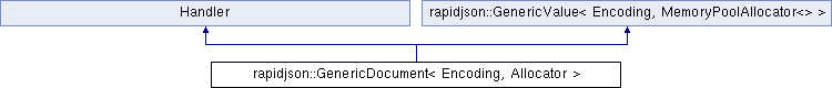 Inheritance diagram for rapidjson::GenericDocument< Encoding, Allocator >:Public Types | |