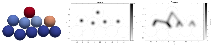 This tutorial presents five particles positioned on a irregular base made from five fixed particles. The system is nondimensionalised such that particle diameter d = 1, particle mass m = 1 and gravity g = 1. The code can be found in FiveParticles.cpp.