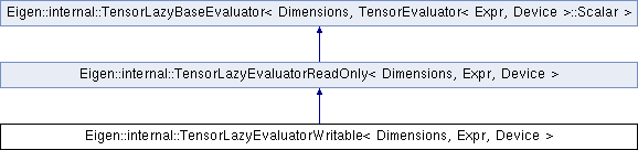 Inheritance diagram for Eigen::internal::TensorLazyEvaluatorWritable< Dimensions, Expr, Device >:Public Types | |